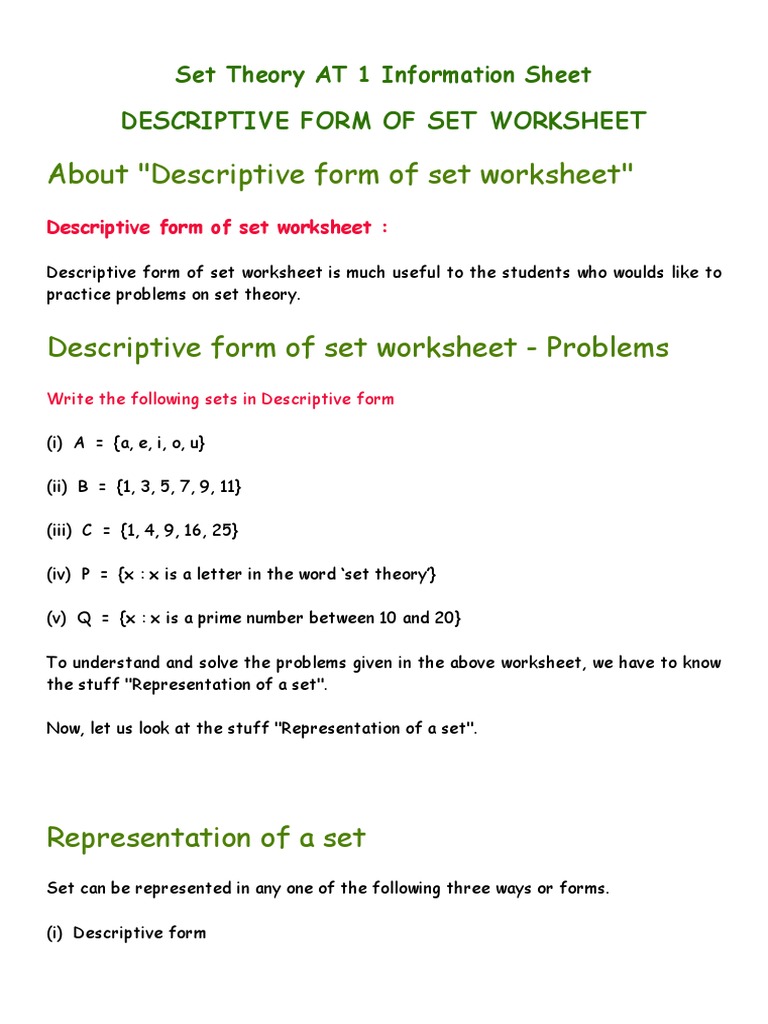 Set theory math worksheets. Worksheets for linear equations - Homeschool Math Find here an unlimited supply of printable worksheets for solving linear equations, available as both PDF and html files. You can customize the worksheets to include one-step, two-step, or multi-step equations, variable on both sides, parenthesis, and more. The worksheets suit pre-algebra and algebra 1 courses (grades 6-9). 8th Grade Math Practice, Topics, Test, Problems, and Worksheets Apr 05, 2021 · All you have to do is simply tap on the quick links available to avail the respective topics and get a grip on them. We included both the theoretical part as well as worksheets for your practice. Our 8th Grade Math Worksheets make it easy for you to test your preparation standard on the corresponding topics. Free printable addition worksheets for whole numbers & integers Find many more ready-made column-addition worksheets on these pages: Grade 2 worksheets, Grade 3 worksheets, and; Grade 4 worksheets. Place value worksheets. Build a two-digit number from tens and ones; Tens and ones - missing addend; Build a three-digit number from the parts; Find the missing place value from a 3-digit number Math Only Math | Learn math step-by-step. There are many interesting and fun activities to help your kids, students and children to enjoy, develop power of thinking and learn numbers, counting, algebra, decimals, arithmetic, fractions, percentage, Profit and Loss, geometry, statistics, set theory, trigonometry and also mensuration, Probability and matrices and even you get help while solving your homework.